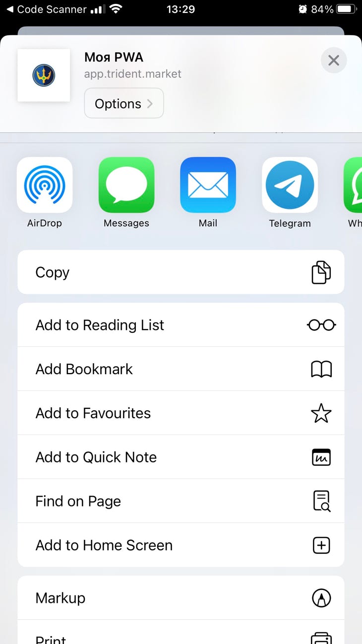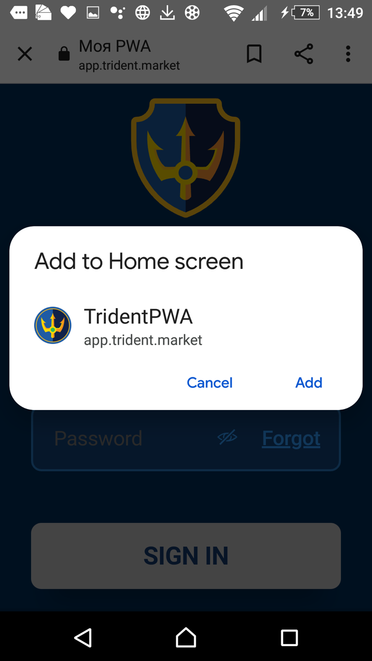 The default Chrome browser is capable of installing PWAs for Android. First, navigate to the site in Chrome. Press the "three dot" icon in the upper right to open the menu. Select "Add to Home screen." Press the "Add" button in the popup. The PWA is now installed and available on your home screen.